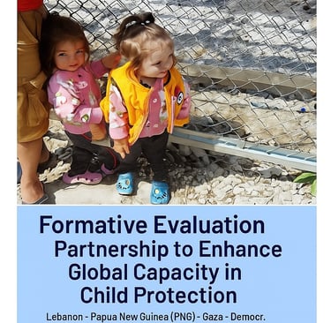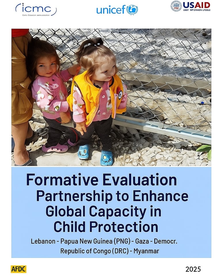 The Child Protection Evaluation, managed for International Catholic Migration Commission (ICMC), USAID, UNICEF, spanned Gaza (Palestinian Territories), Lebanon, Myanmar, Democratic Republic of Congo (DRC), Papua New Guinea (PNG), leading the evaluation of a project to strengthen child protection frameworks in conflict-affected regions .