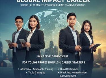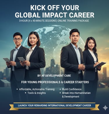 This 3-hour (4 x 45-minute sessions) online Training Package: Kick Off Your Global Impact Career by AF Development Care is designed for young professionals and career starters eager to launch a rewarding career in international development. This affordable, actionable training provides the tools, insights, and confidence to break into the humanitarian and development sector.